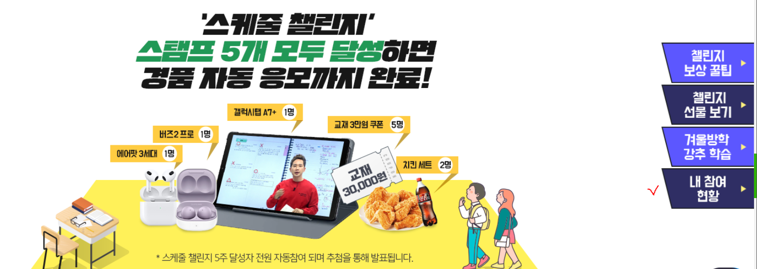 갤럭시탭 1명 버즈2 프로 1명 에어팟 3세대 1명 치킨세트 2명 교재 3만원 쿠폰 5명